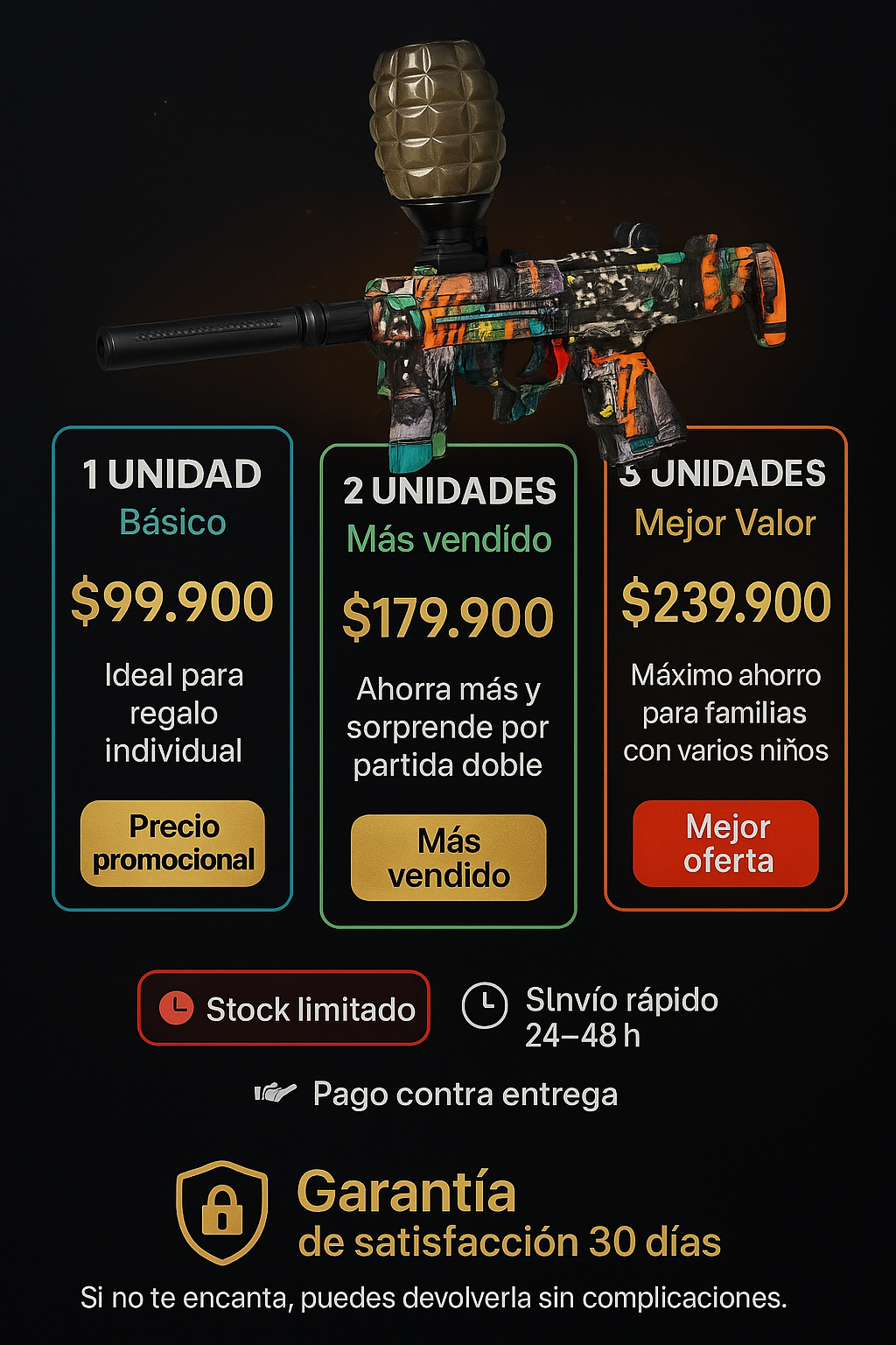 Santiago Lozano – Barranquilla La relación calidad-precio es top. Dispara rápido, carga bien y trae buen depósito. Llegó en 3 días.